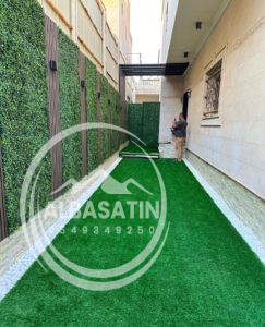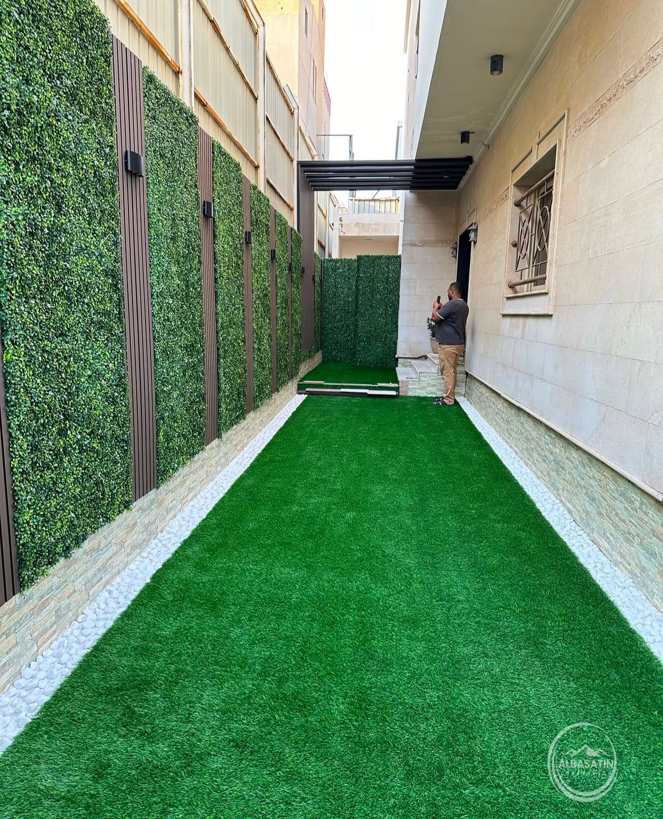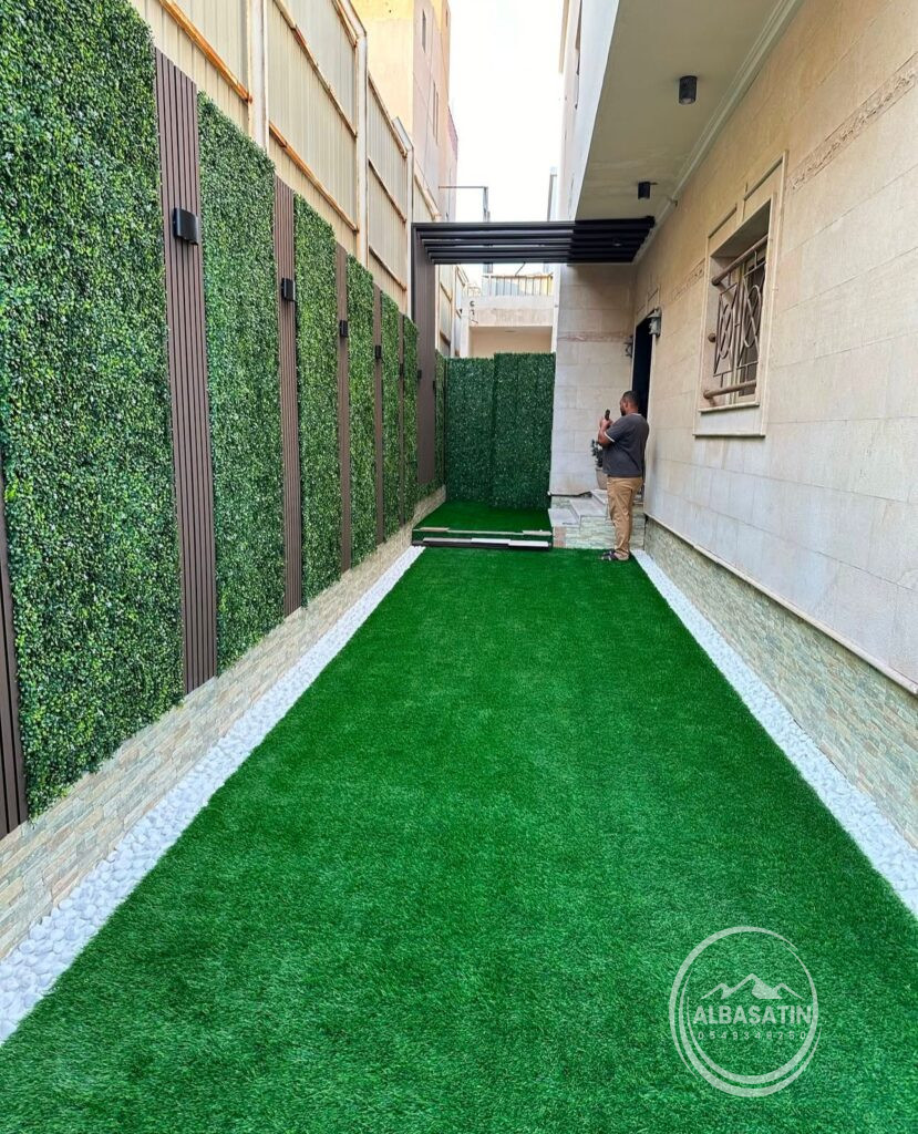 - العشب الاصطناعي: متوفر بألوان وارتفاعات متعددة، ويعطي مظهرًا دائمًا وجميلًا.
